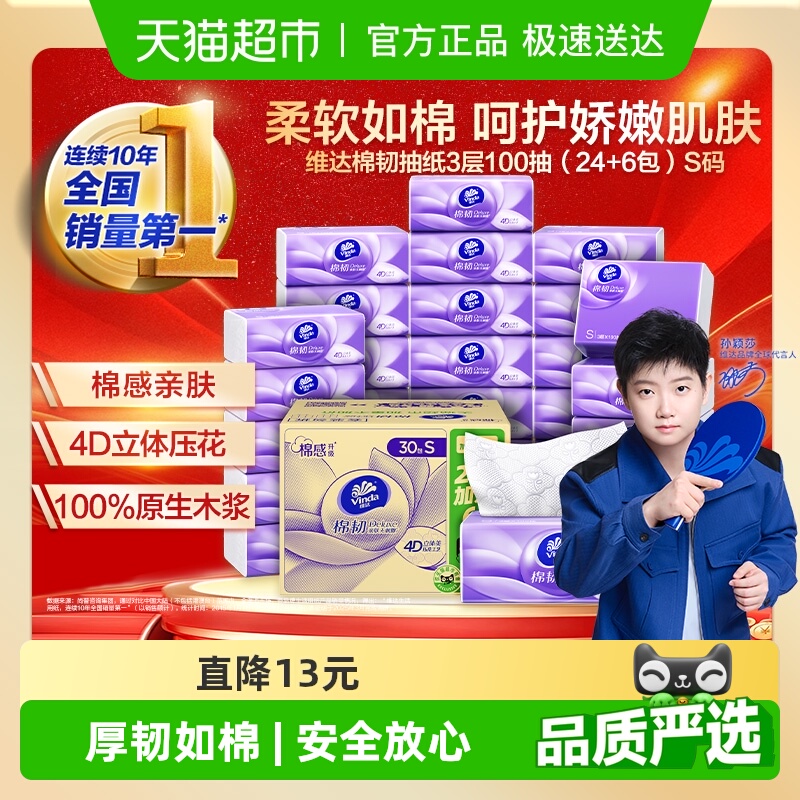 【孙颖莎推荐】维达棉韧压花抽纸3层S码家用纸巾实惠整箱装