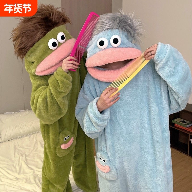 情侣丑鱼女款连体睡衣冬季珊瑚绒加厚保暖亲子搞怪大嘴怪睡袍加绒