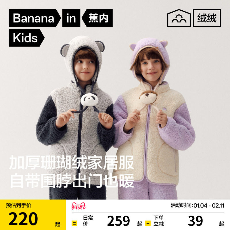 蕉内绒绒5系男童羊羔绒连帽加厚家居服套装冬亲子装女童儿童睡衣