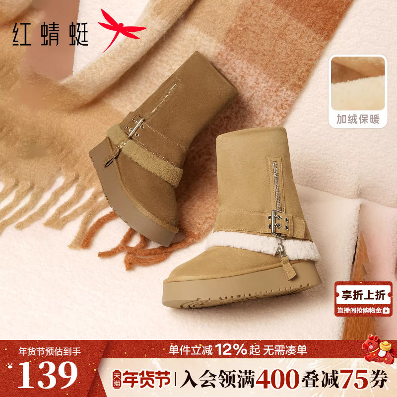 红蜻蜓厚底雪地靴女冬季新款女鞋加绒保暖勃肯鞋舒适软底毛绒棉鞋