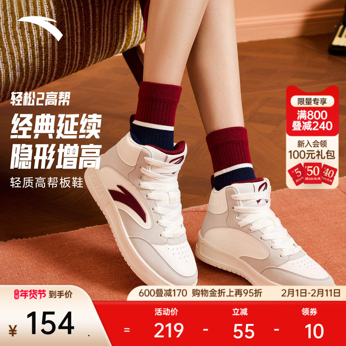 安踏轻松2丨经典撞色高帮板鞋女鞋2025冬季新款滑板鞋潮流运动鞋