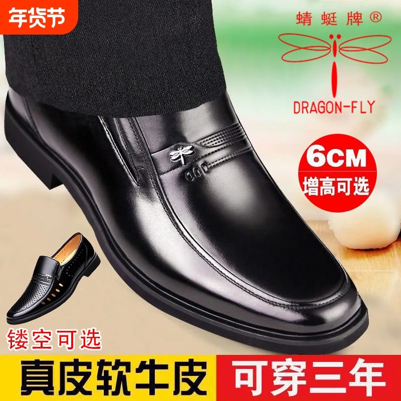 真皮牛皮蜻蜓牌男鞋商务正装爸爸真皮鞋内增高休闲软底耐磨鞋黑色