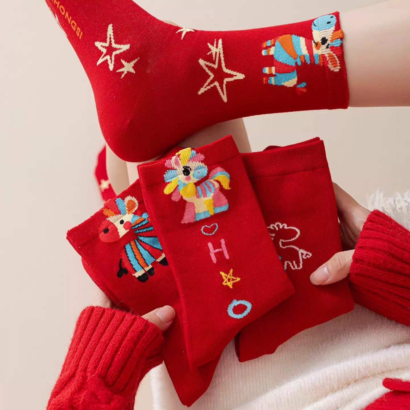 马年新年礼物红色袜2026属马秋冬男士情侣袜本命年袜子女款