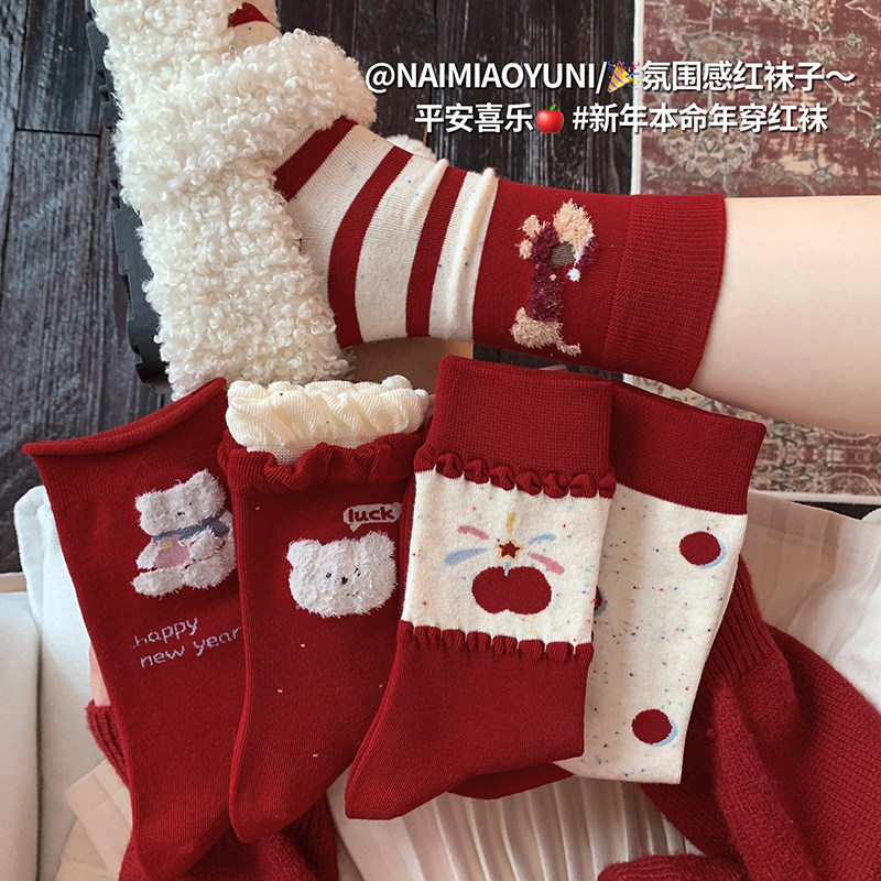 花边植绒可爱红袜子女本命年秋冬棉袜马年红色新年过年中筒袜长袜