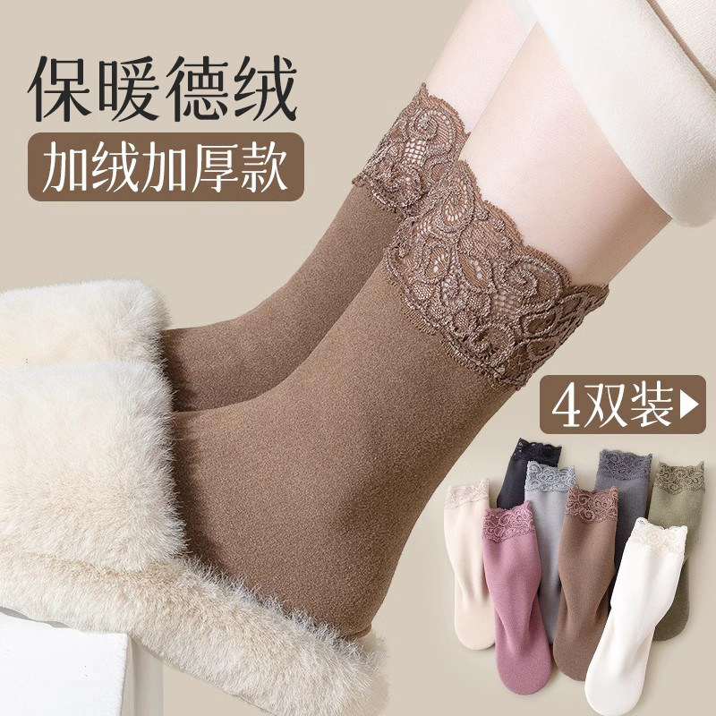 德绒袜子女秋冬季中筒袜女士蕾丝加绒加厚保暖棉袜睡眠地板雪地袜
