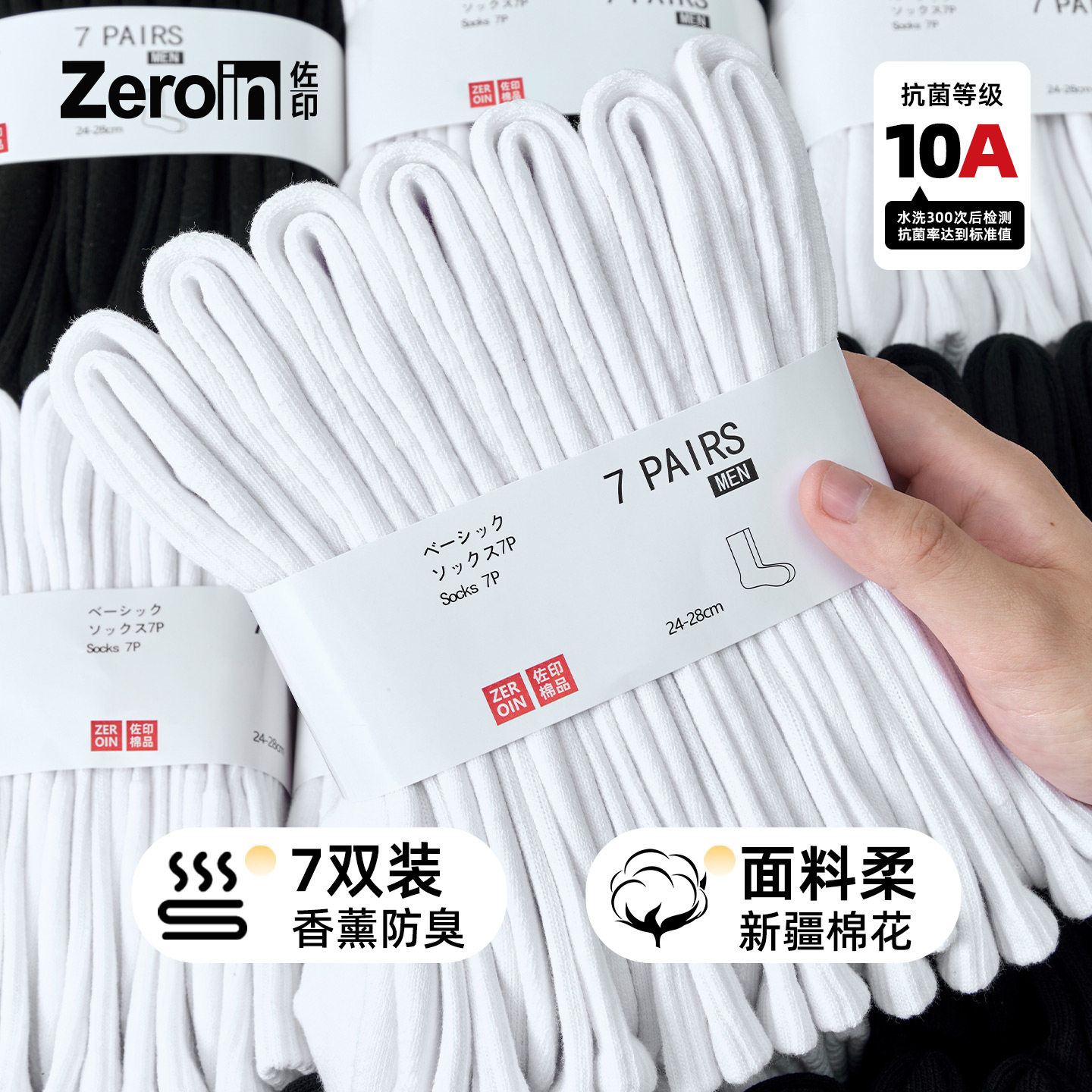 佐印袜子男士冬纯棉纱线加厚长袜防臭抗菌吸汗男款中筒白色运动袜