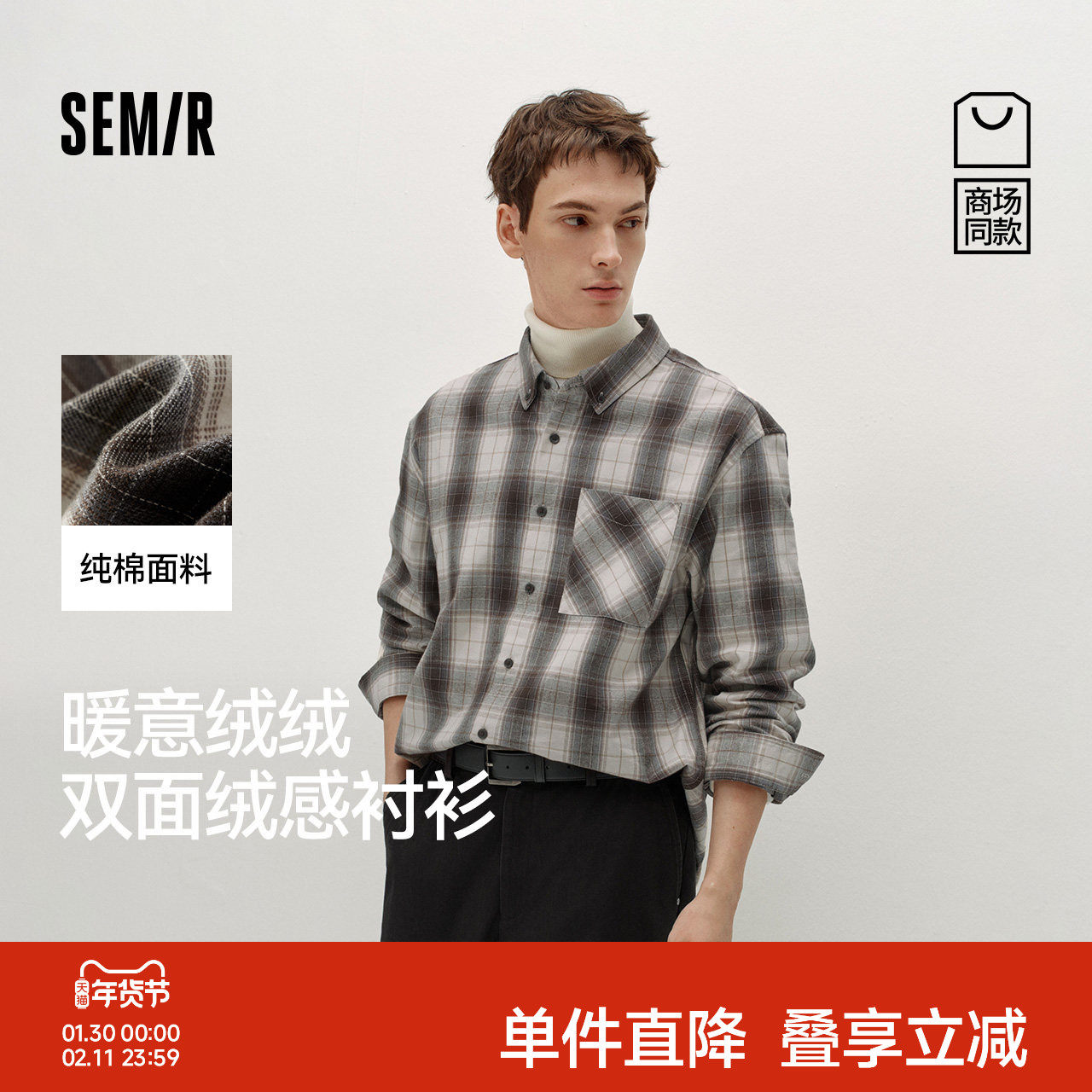 商场同款|森马长袖衬衫男冬季格纹外套纯棉2025新款内搭外穿上衣