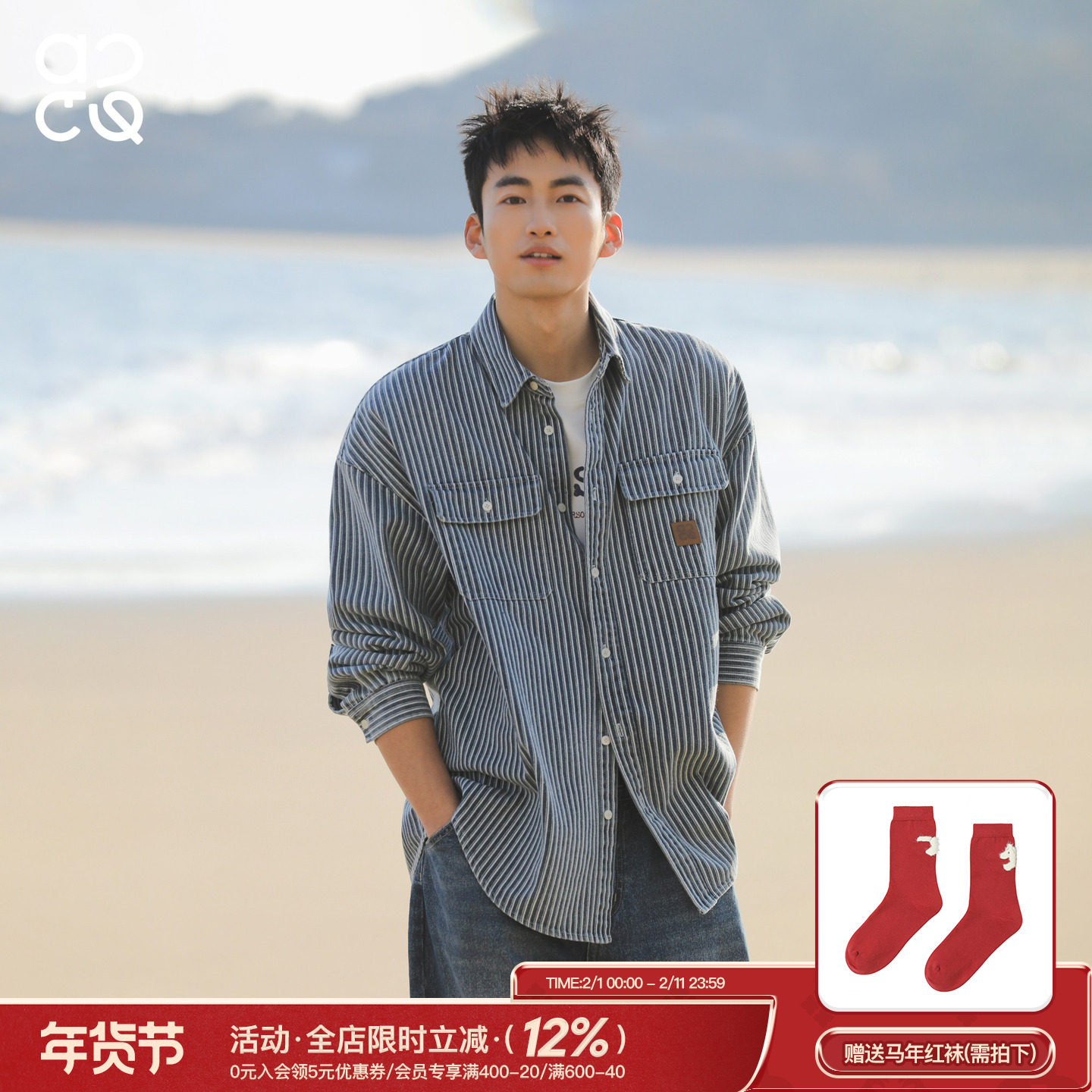 【马唬联名】三福2026春季男士刺绣徽章条纹牛仔长衬衫516583