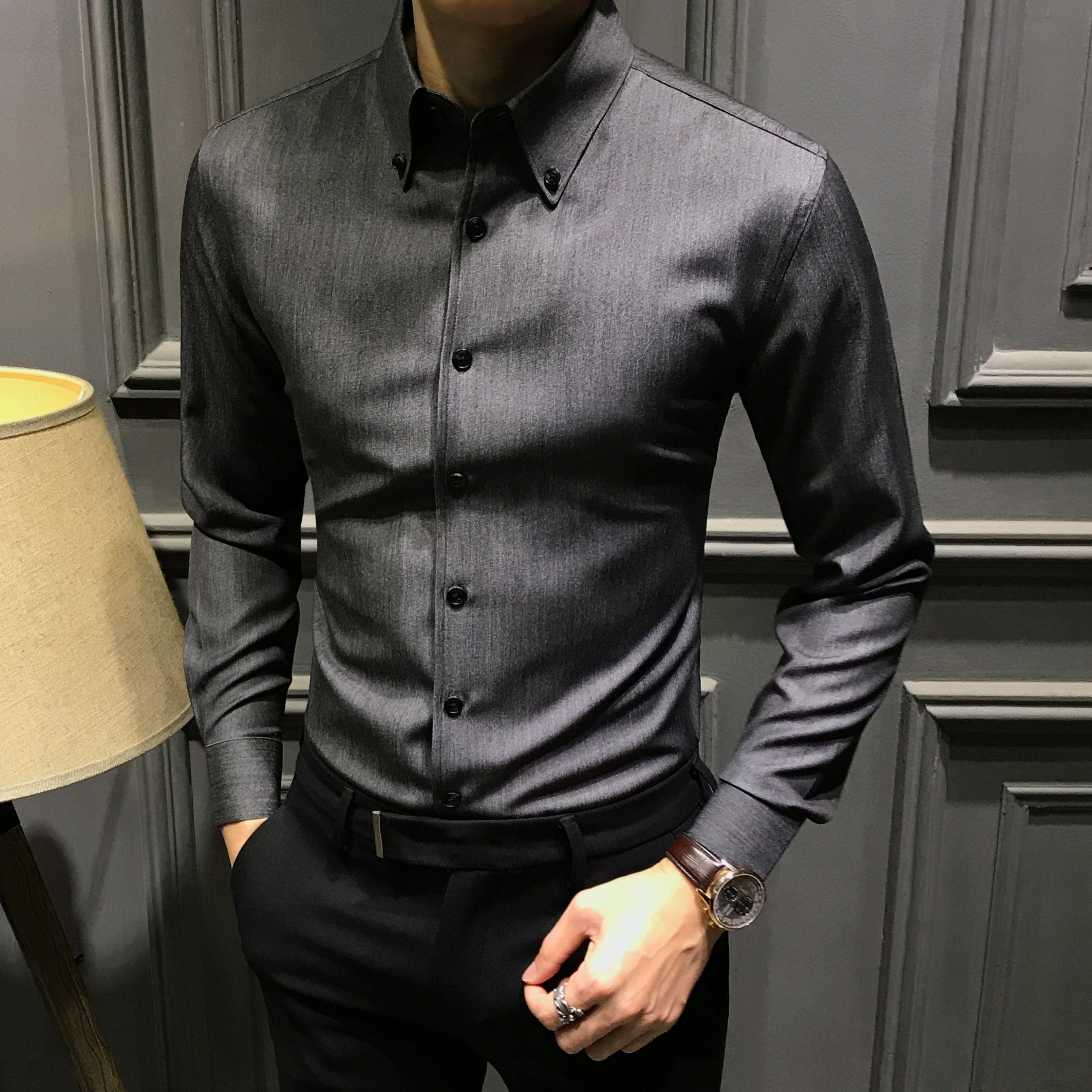 SF/春秋气质款长袖衬衫韩风潮流复古痞帅男生高级垂感宽松版衬衣