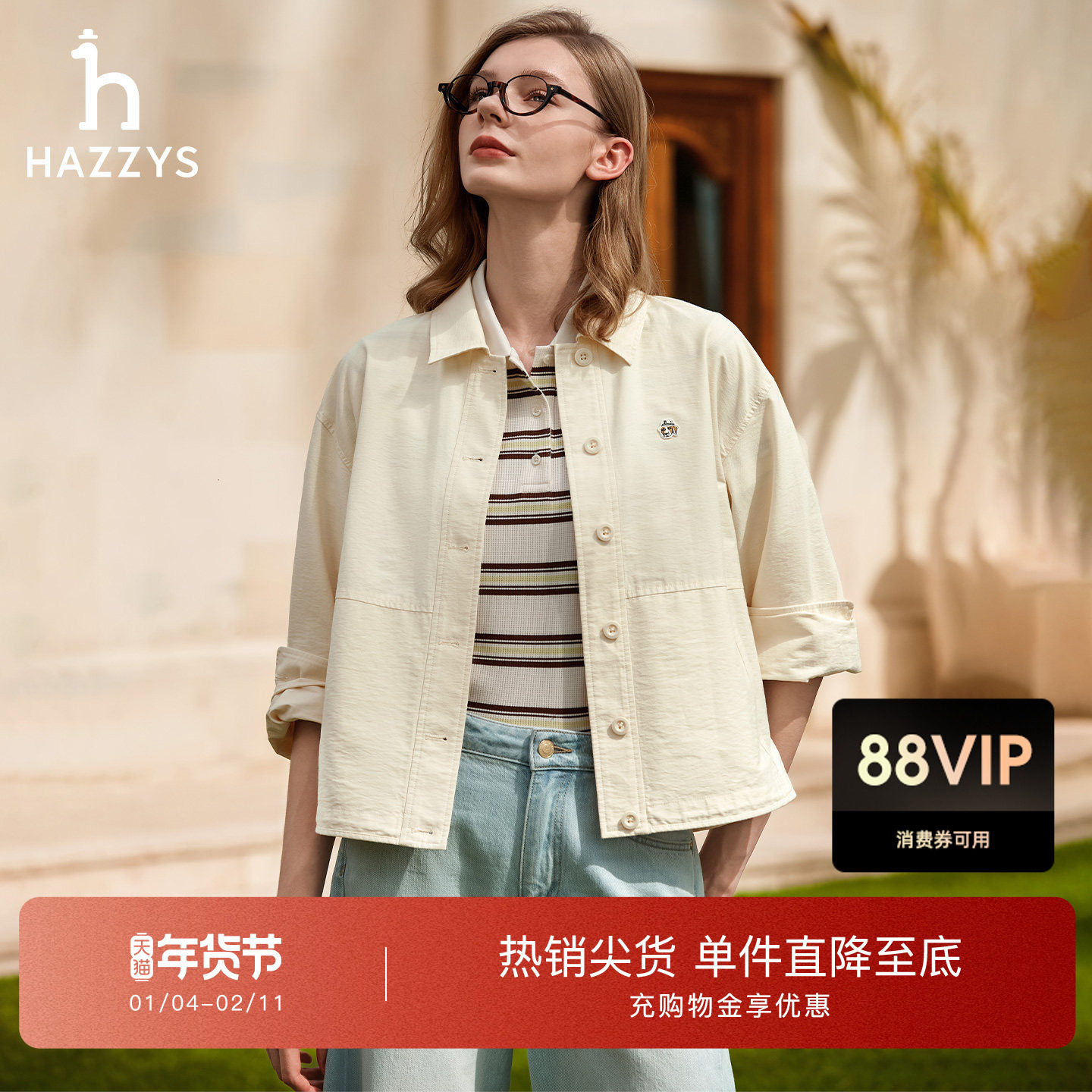 Hazzys哈吉斯长袖衬衫女士春季休闲时尚衬衣宽松通勤翻领上衣外套
