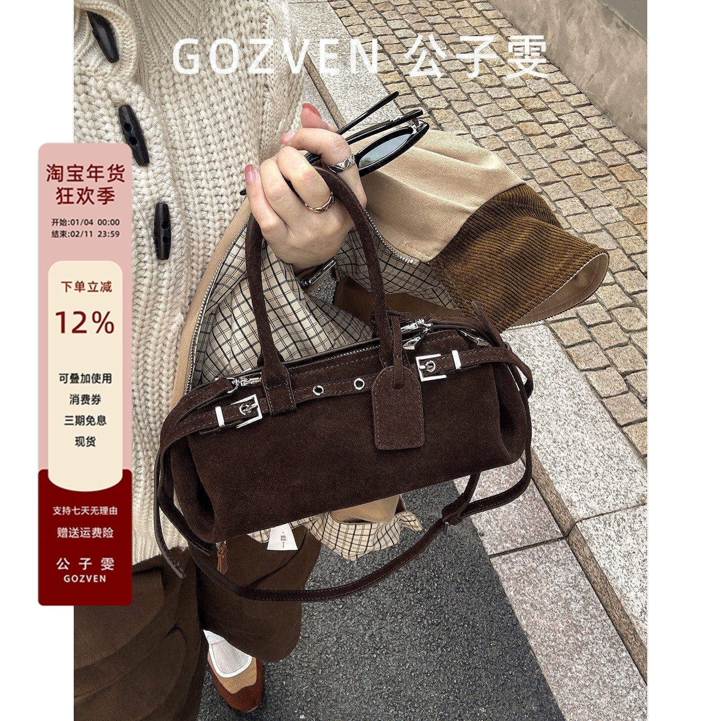 【公子雯】赵露思同款腊肠包秋冬小众麂皮磨砂牛皮手提斜挎机车包