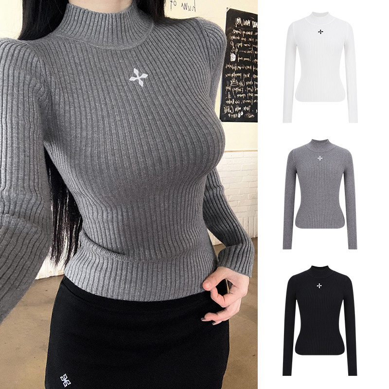 MosesQueen魔西女王灰色半高领针织打底衫女内搭毛衣修身坑条上衣