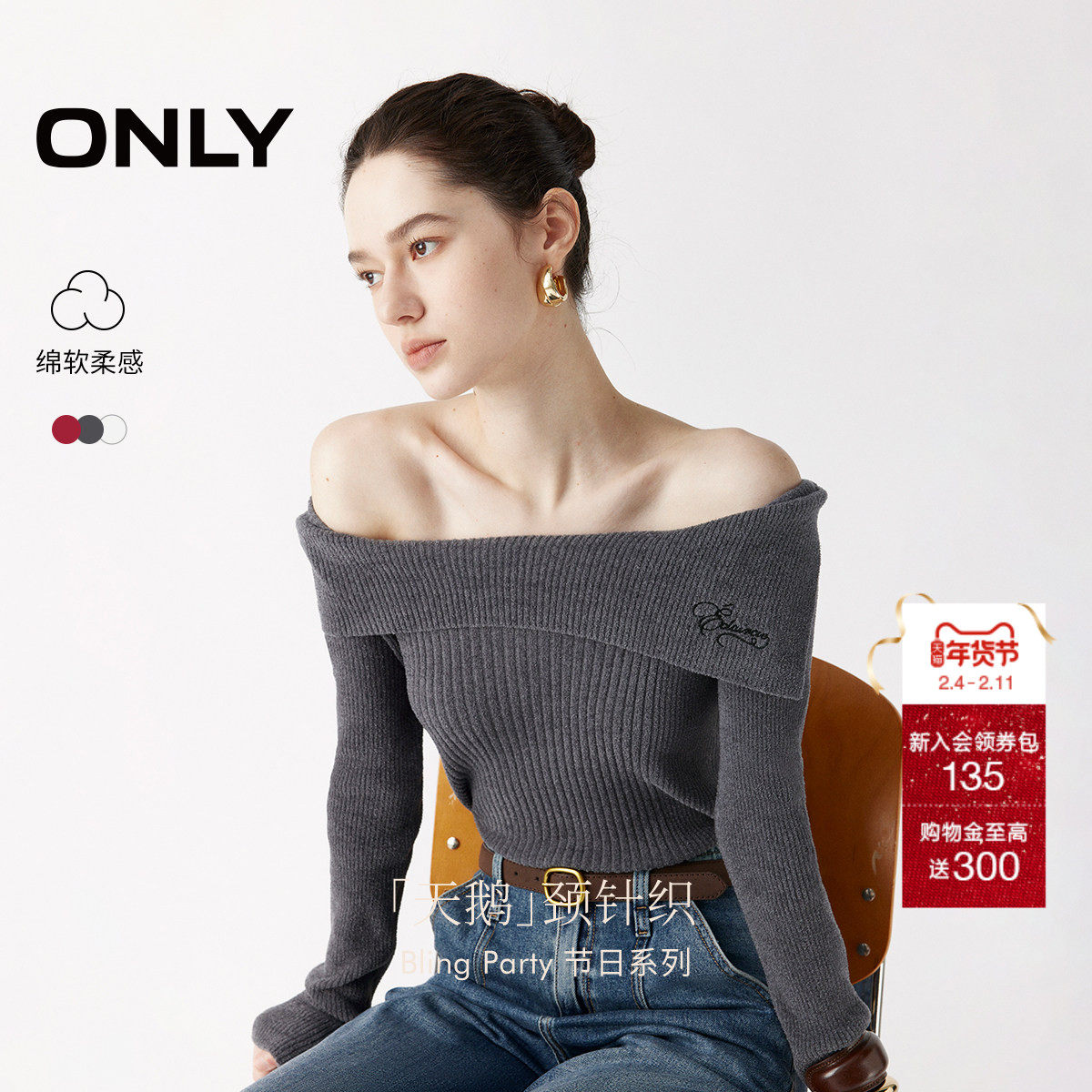 【爆款】ONLY2026春季新款露肩一字领两穿纯色约会修身打底针织衫