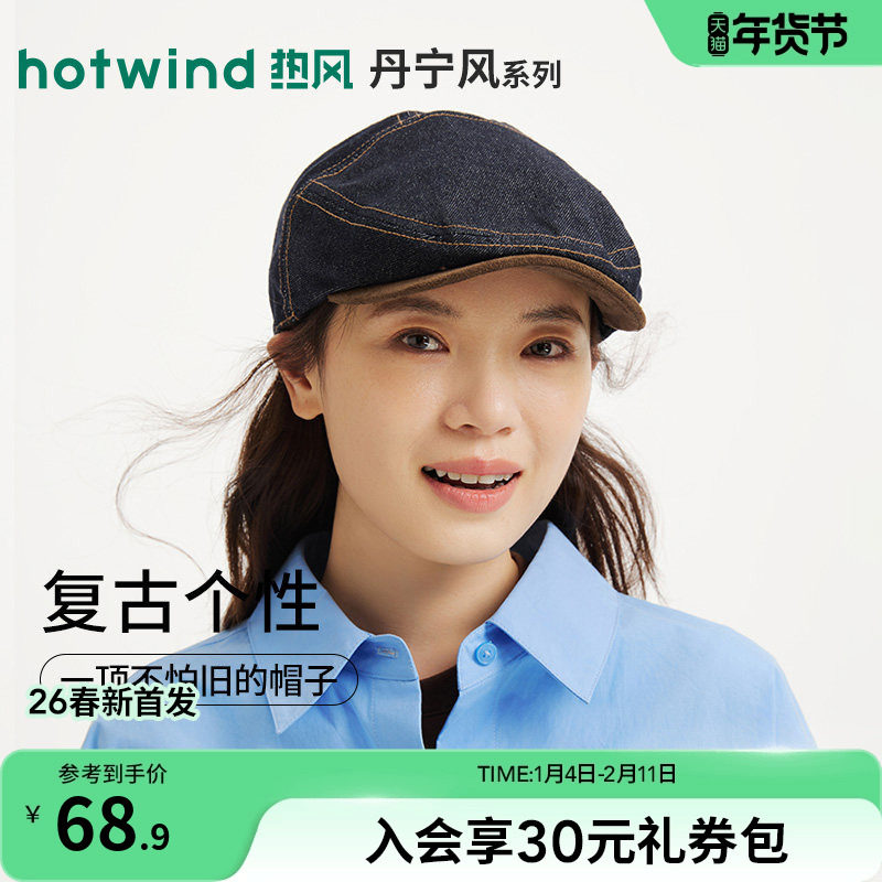 热风女士帽子2026年春季新款牛仔拼接鸭舌帽显脸小美式复古前进帽