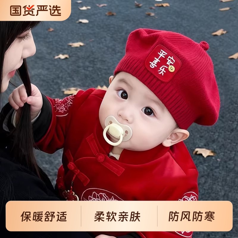 婴幼儿帽子秋冬季男女宝宝红色贝雷帽可爱超萌新年红色毛线帽针织