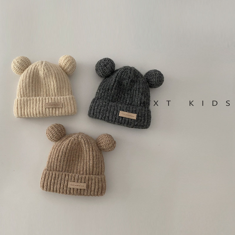 婴儿毛线帽秋冬季洋气小标小熊套头帽子冬天婴幼儿宝宝保暖针织帽