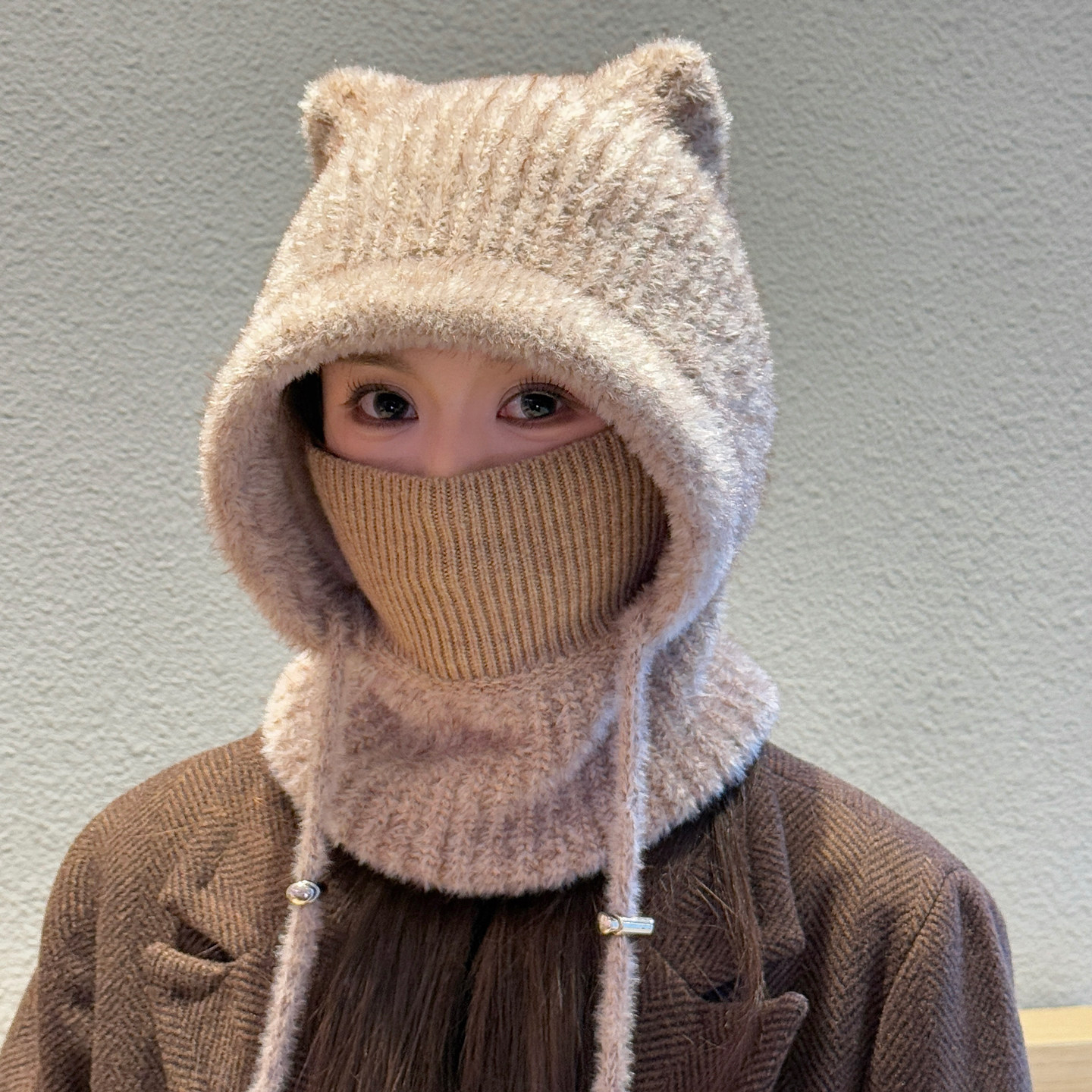 帽子女秋冬季可爱猫耳朵围脖面罩一体毛线帽户外骑行防寒保暖防风
