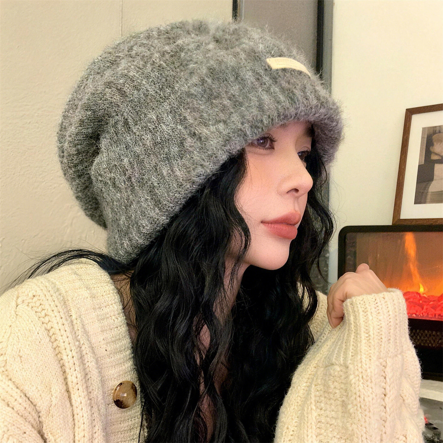 日系秋冬毛线堆堆帽大头围显脸小百搭灰冷帽保暖帽子情侣护耳针织