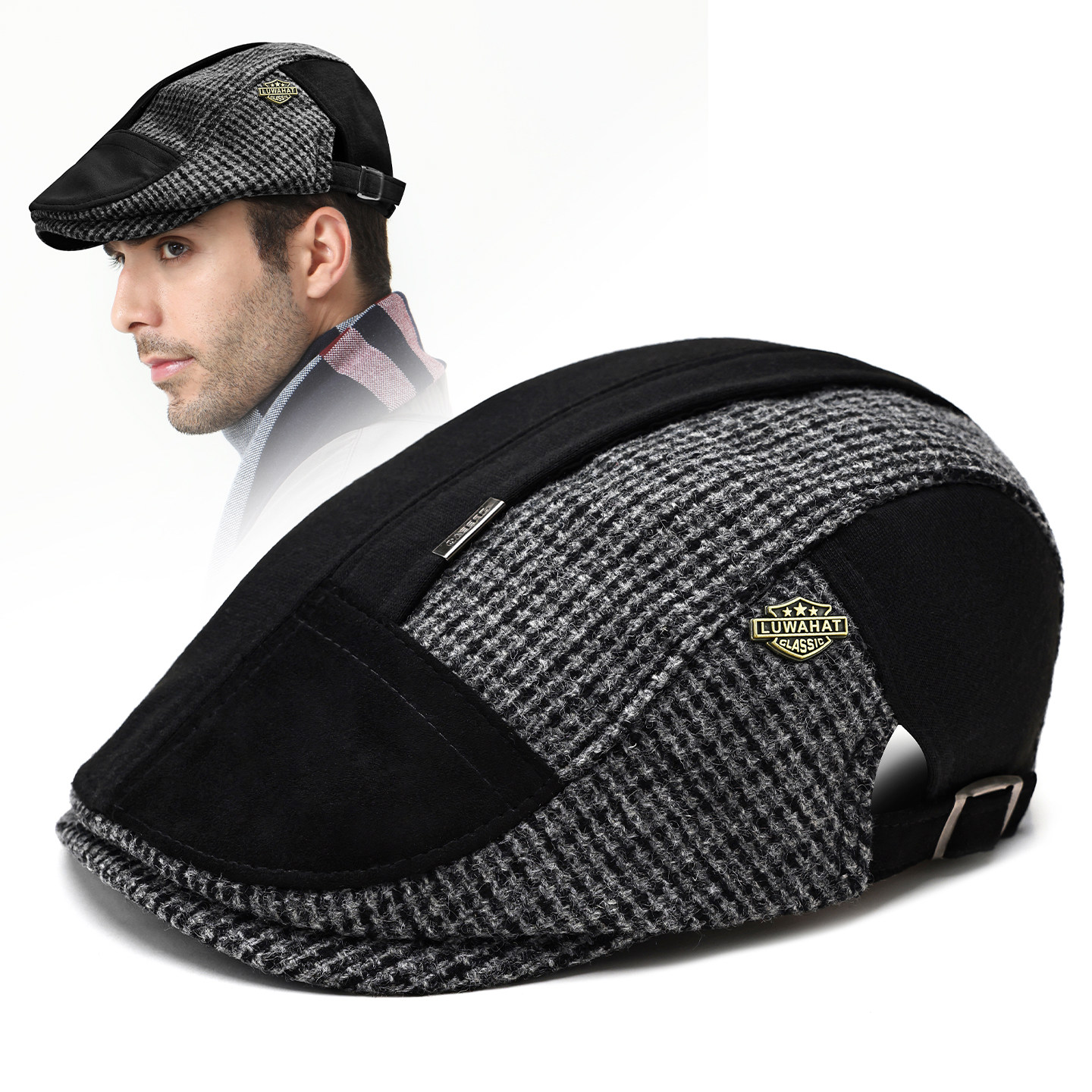 路瓦羊毛呢拼接混搭帽子男秋冬厚款保暖复古户外中老年贝雷帽防寒