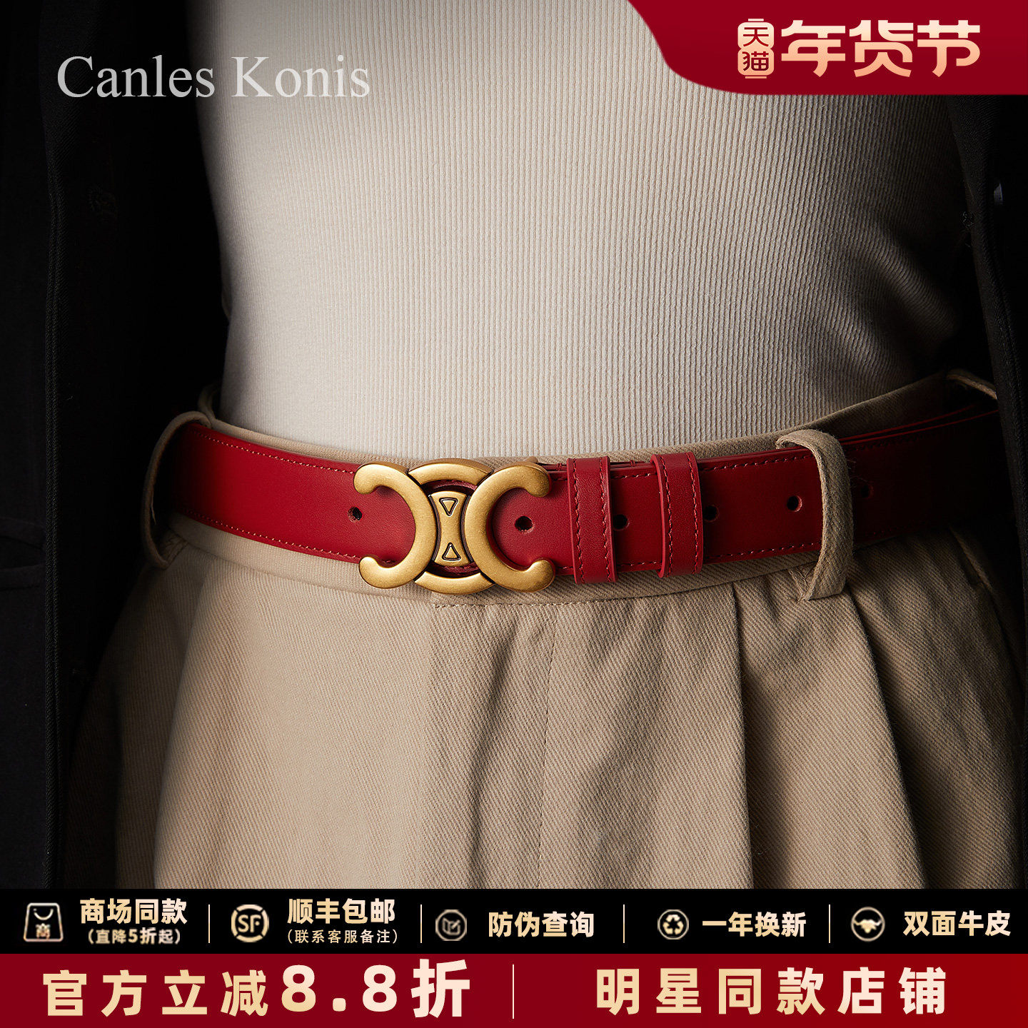 Canles Konis官方店真皮女士皮带本命年红色宽腰带女装饰新年礼物