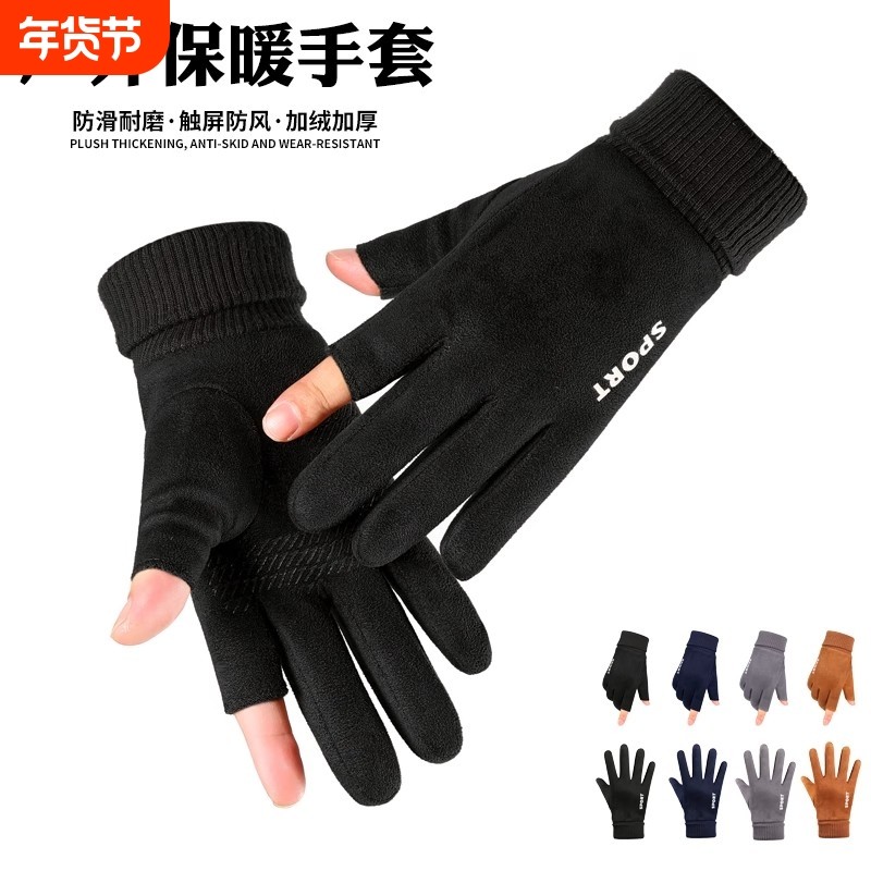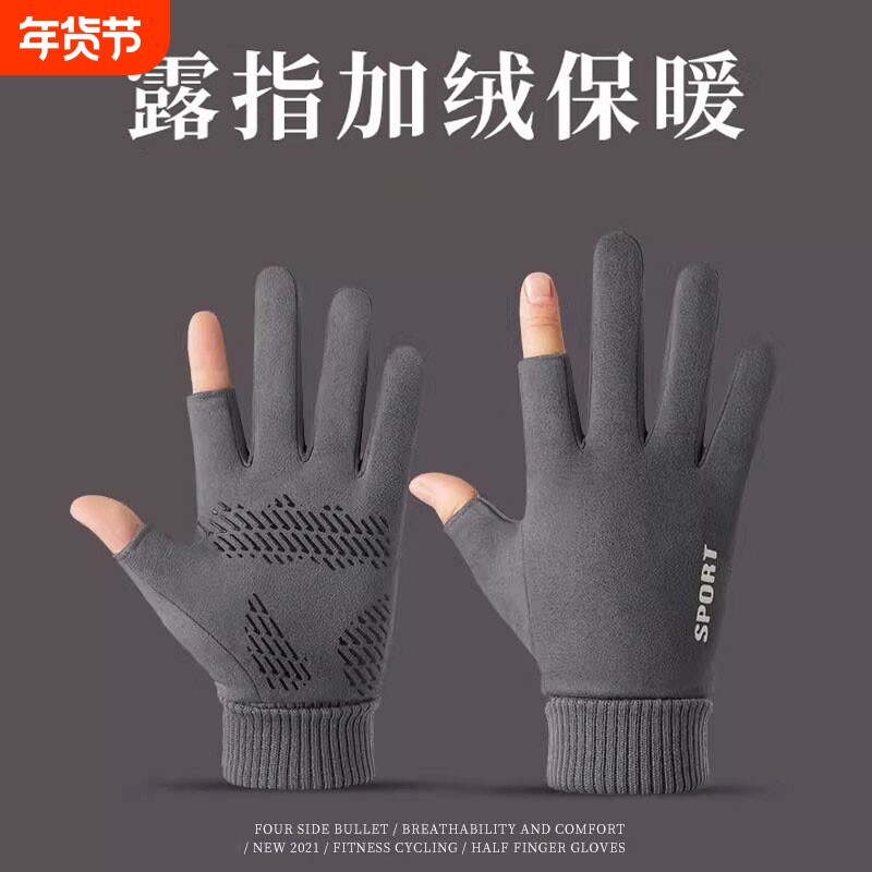男士露二指加绒保暖手套秋冬防寒防风开车骑行办公玩手机触屏手套