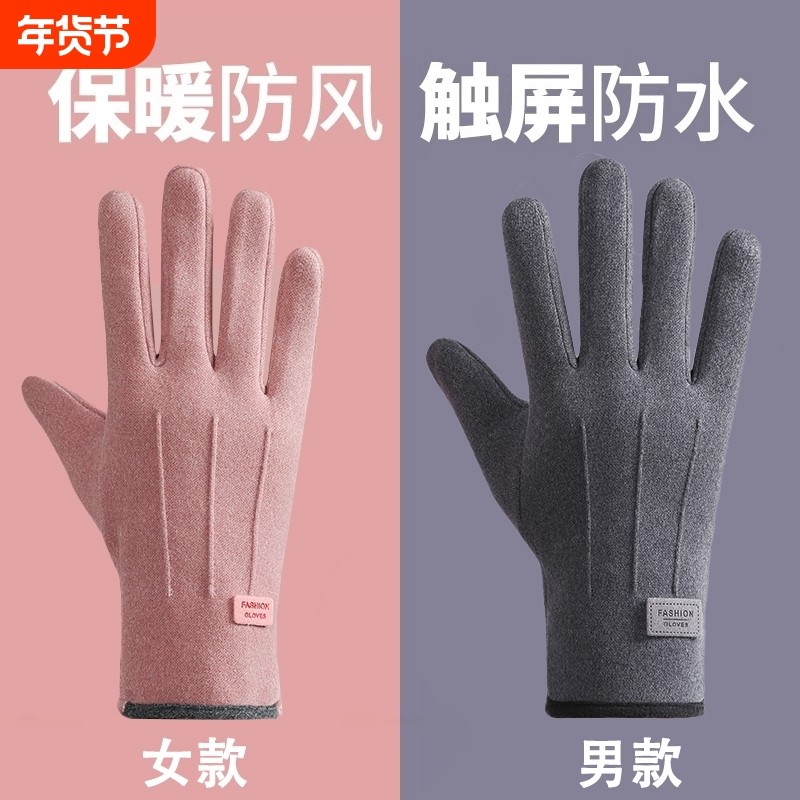 加绒手套女男加厚骑电动车手套麂皮保暖防水手套绒冬季可触屏手套