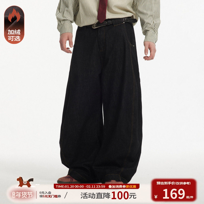 老爷车牛仔裤男专柜正品2025秋冬新款冬季加绒宽松香港男士直筒裤