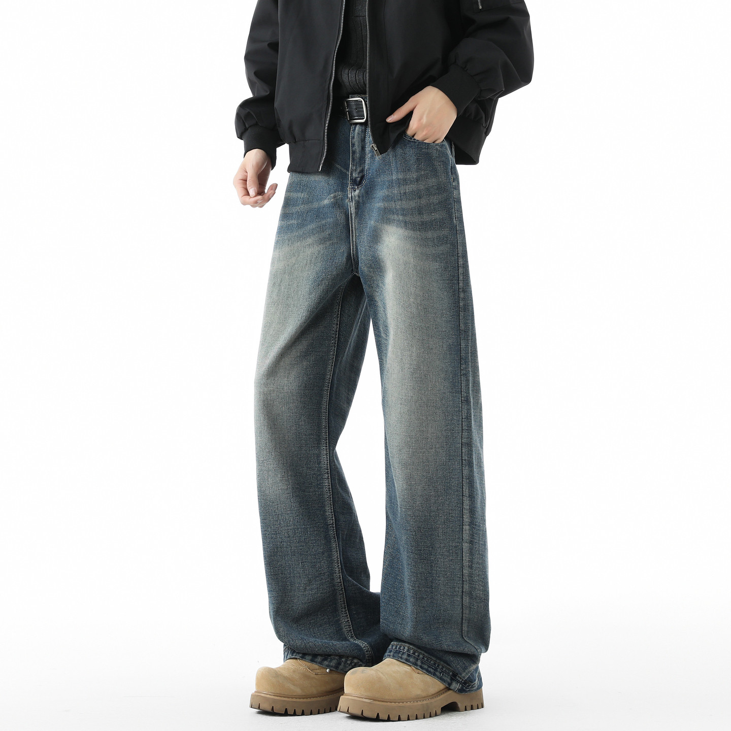 JZD【慵懒肌肉狗】美式复古水洗长裤 直筒阔腿显瘦百搭牛仔裤男