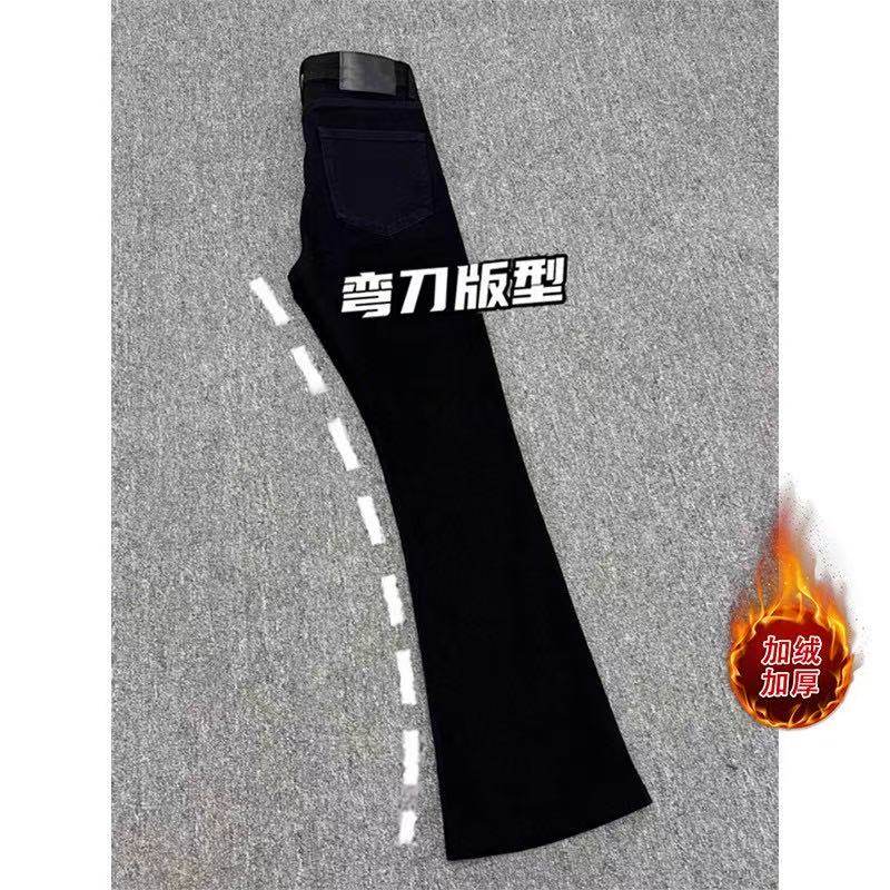 黑色弯刀微喇叭裤男生秋冬弹力加绒牛仔裤美式高街学生裤子加长版