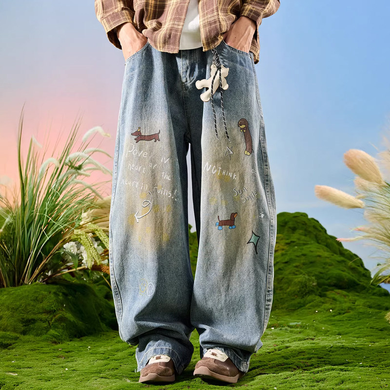 Nuthink美式复古小狗牛仔裤阔腿水洗做旧垂感裤子男新款2026年春