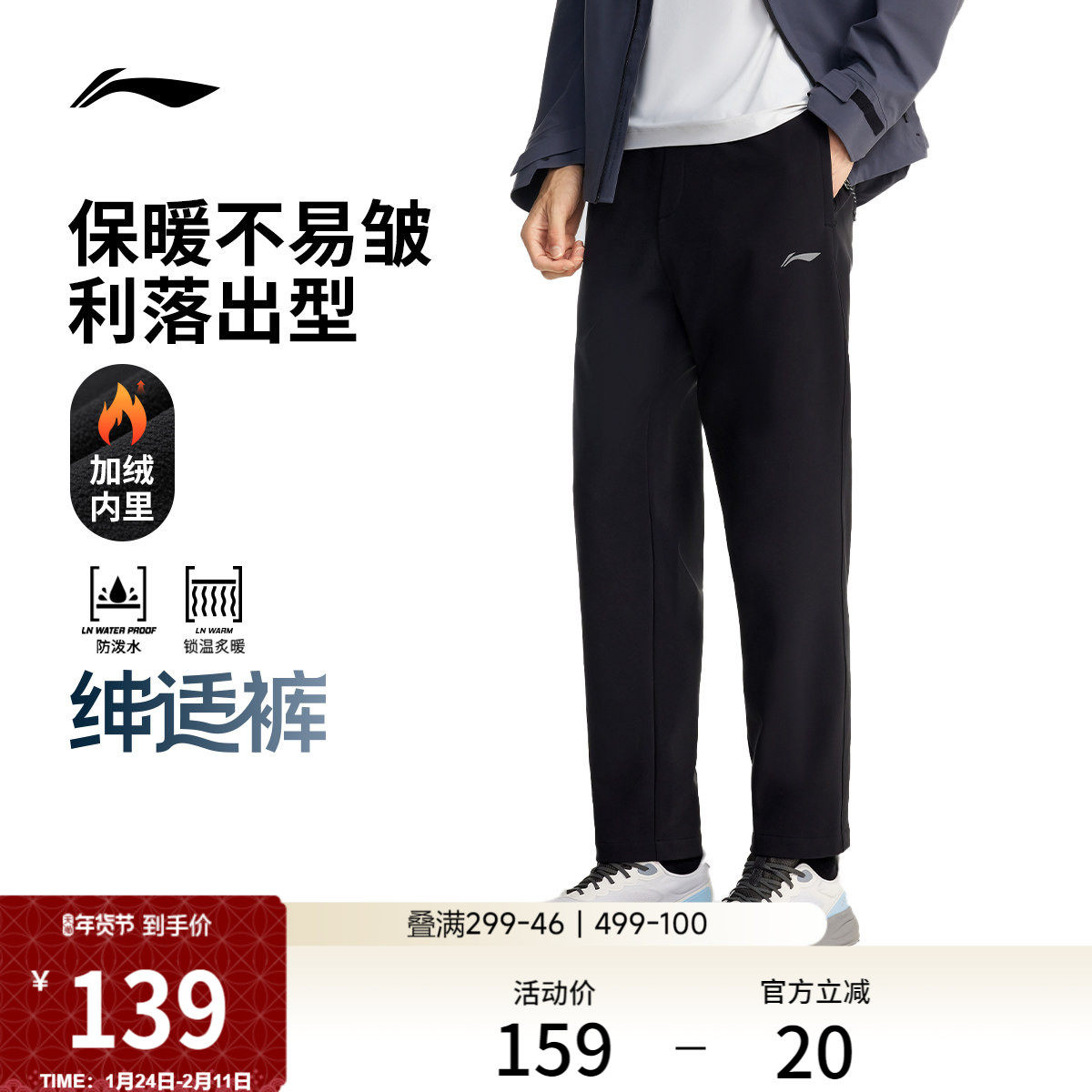 李宁绅适裤丨运动裤男冬季新款加绒保暖直筒黑色裤子商务通勤长裤