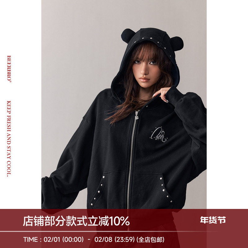 BeerBro 『复古声浪』包容性强异形熊耳朵短款连帽卫衣外套女