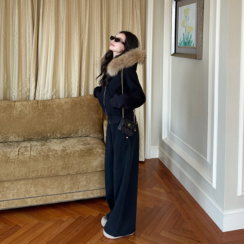金苏一 加绒卫衣休闲裤两件套冬季韩版小个子毛领外套直筒裤子潮