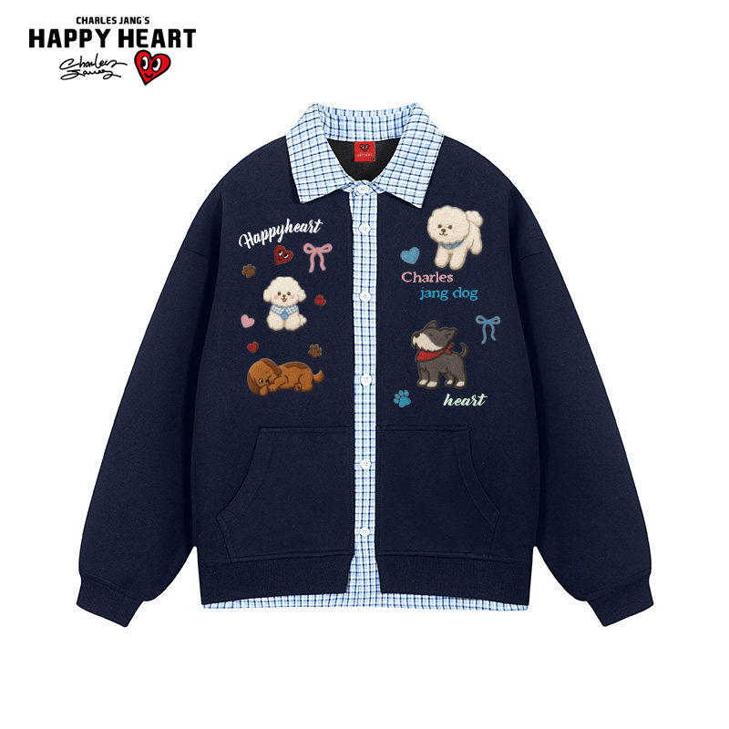 查尔斯桃心 美式小狗印花开衫卫衣男假两件翻领潮牌百搭情侣外套