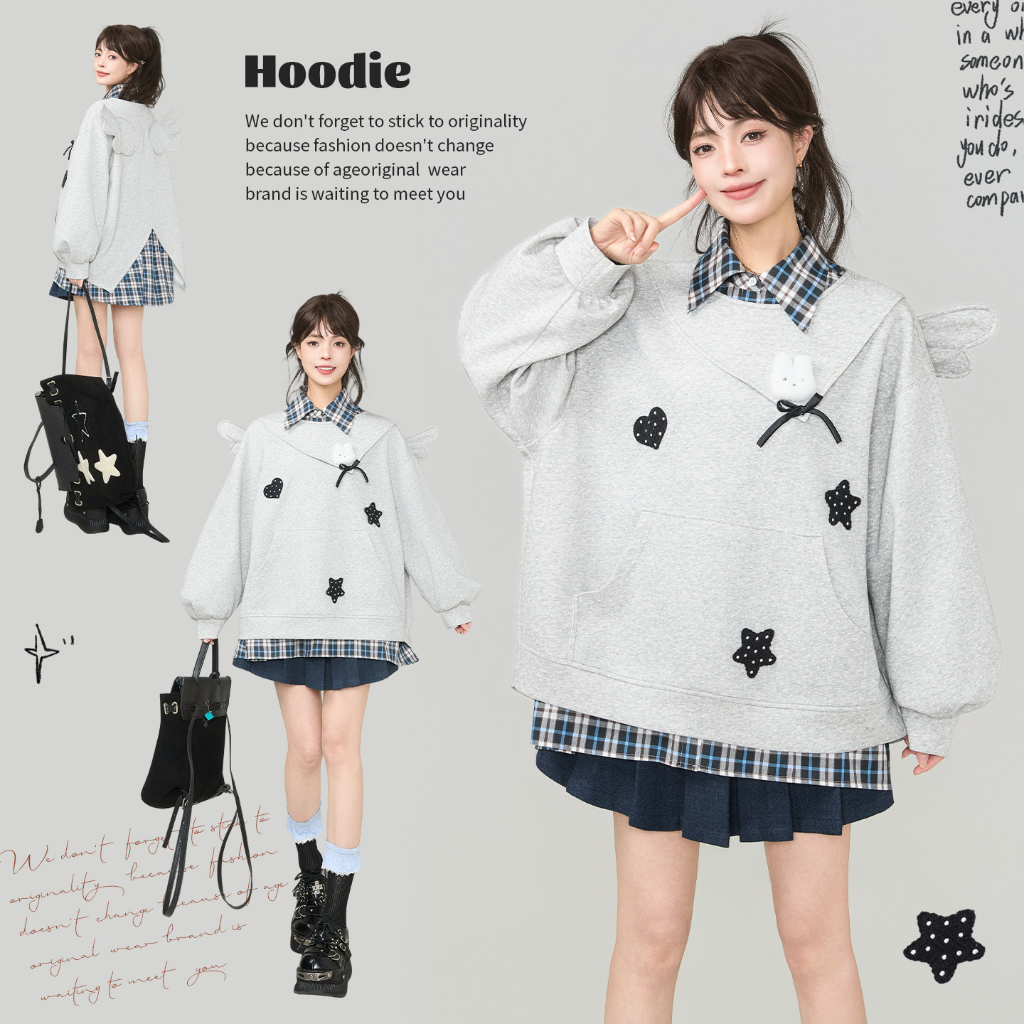 KEIKO 少女风软骨羽翼饰灰色卫衣2026春季设计感星星刺绣翻领上衣