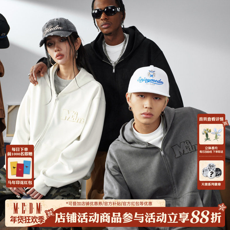 MEDM25SS麂皮绒彩色字体拉帽衫男士春秋美式复古连帽卫衣女情侣款
