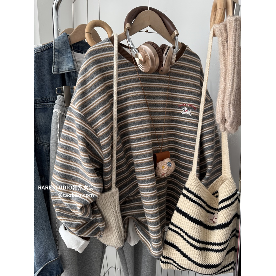 刺绣小狗条纹卫衣女秋冬新款韩系软糯磨毛绒百搭慵懒宽松休闲上衣