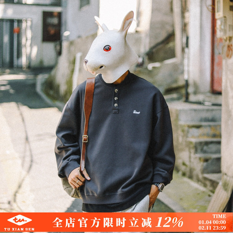 兔先森春秋季美式复古简约刺绣亨利领卫衣男宽松休闲运动套头上衣
