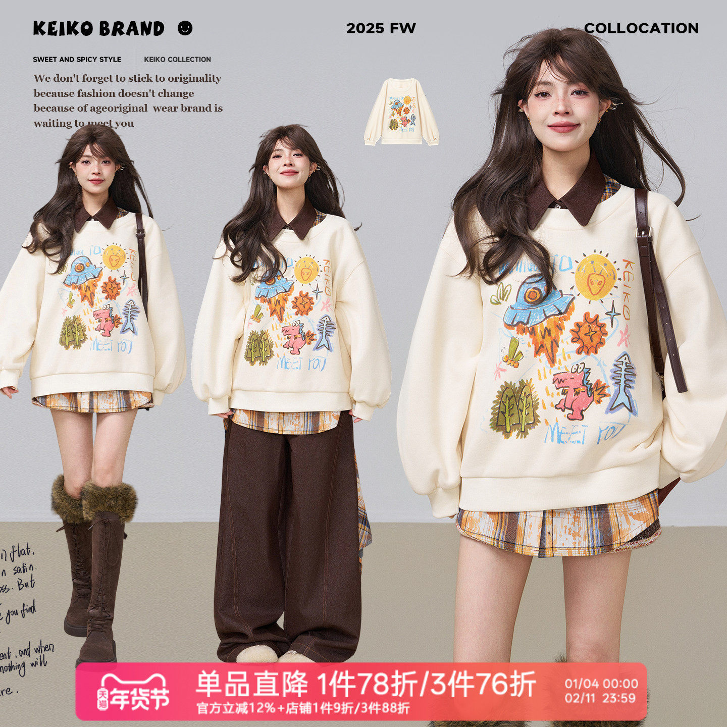 KEIKO 涂鸦卡通印花加绒卫衣女26春季减龄宽松圆领休闲长袖上衣