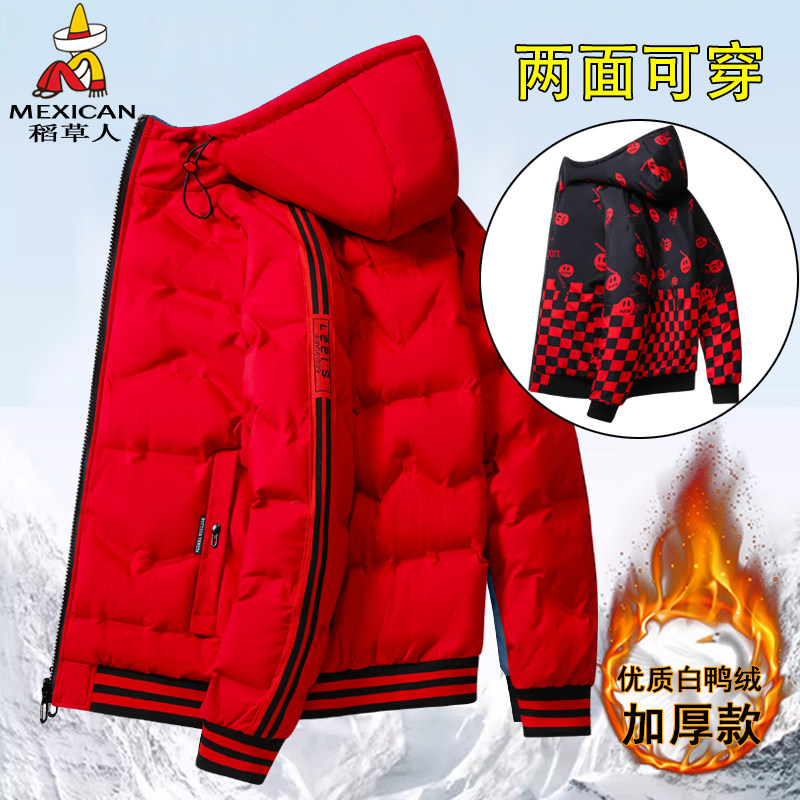 稻草人本命年红色羽绒服男士冬季2025新款加厚连帽双面穿休闲外套