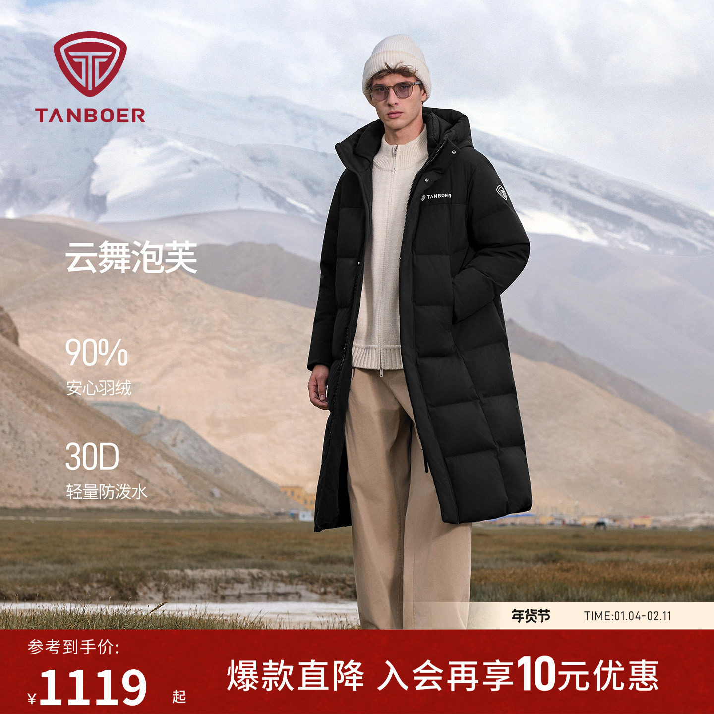 坦博尔25冬季新款男士羽绒服过膝长款连帽防风保暖加厚高品质外套