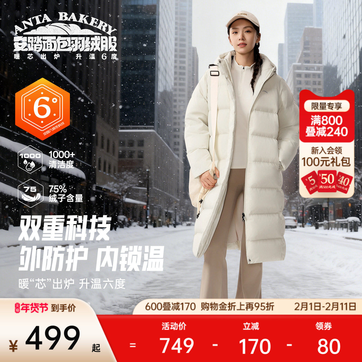 安踏面包羽绒丨中长款连帽羽绒服女士2025冬季防泼水鸭绒保暖外套