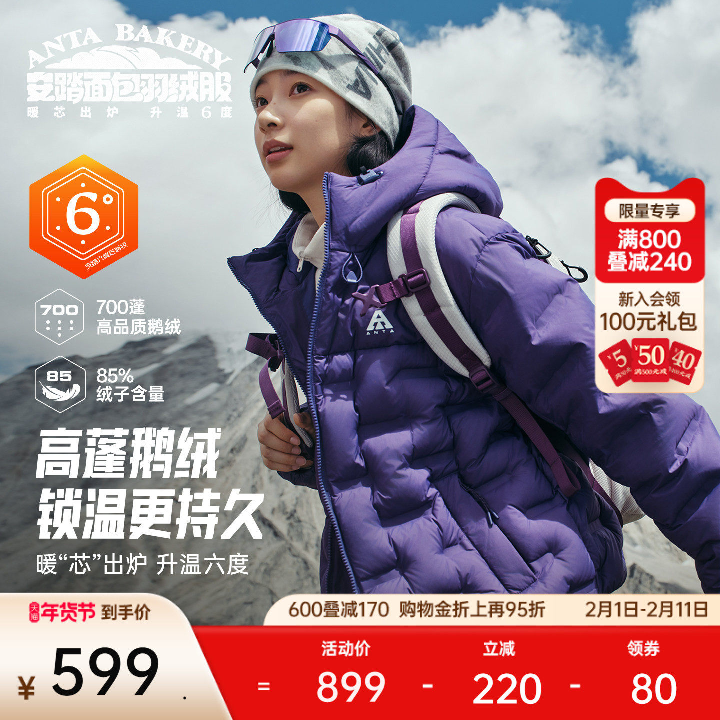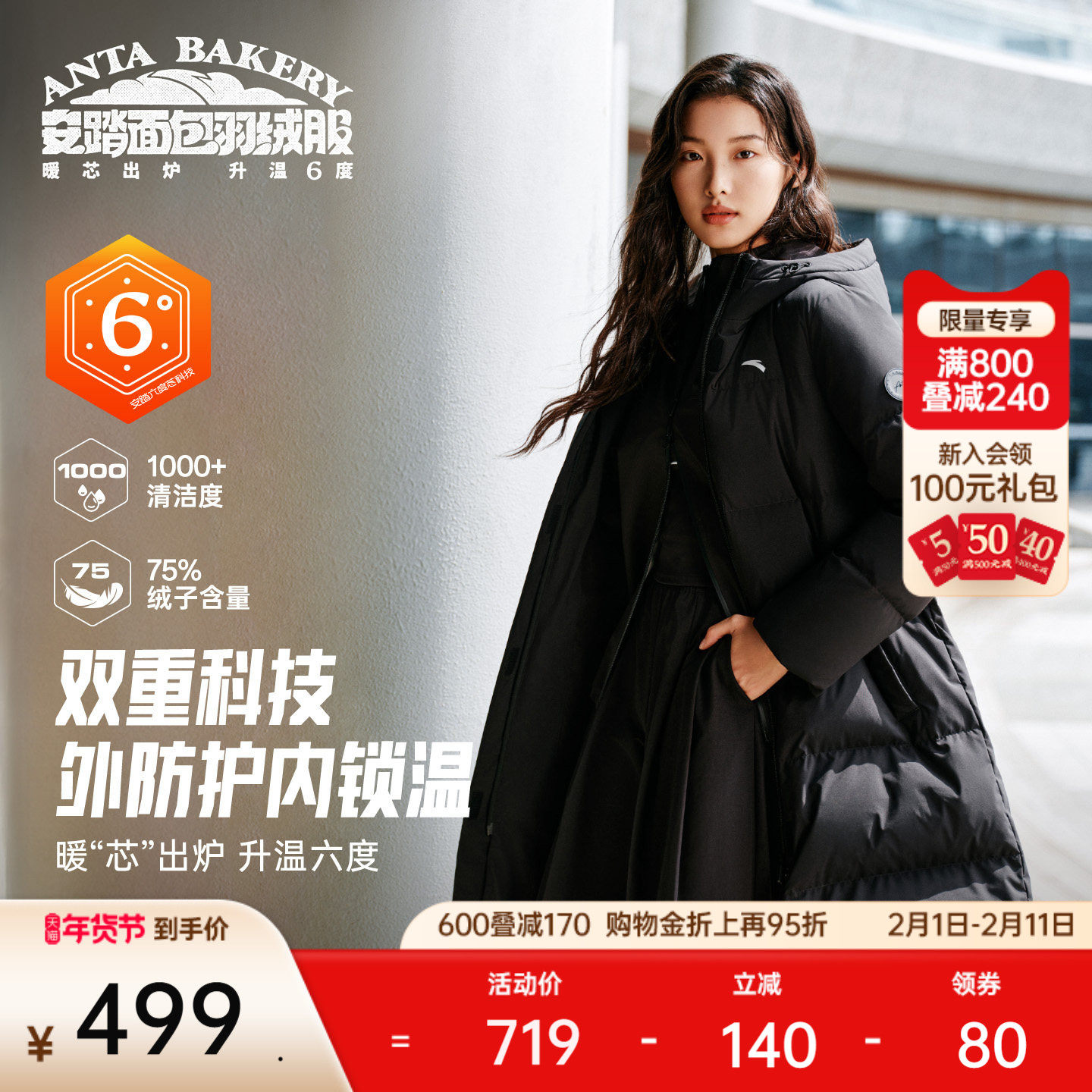 安踏面包羽绒服丨六度芯鹅绒服户外防风外套女士冬季加厚保暖夹克