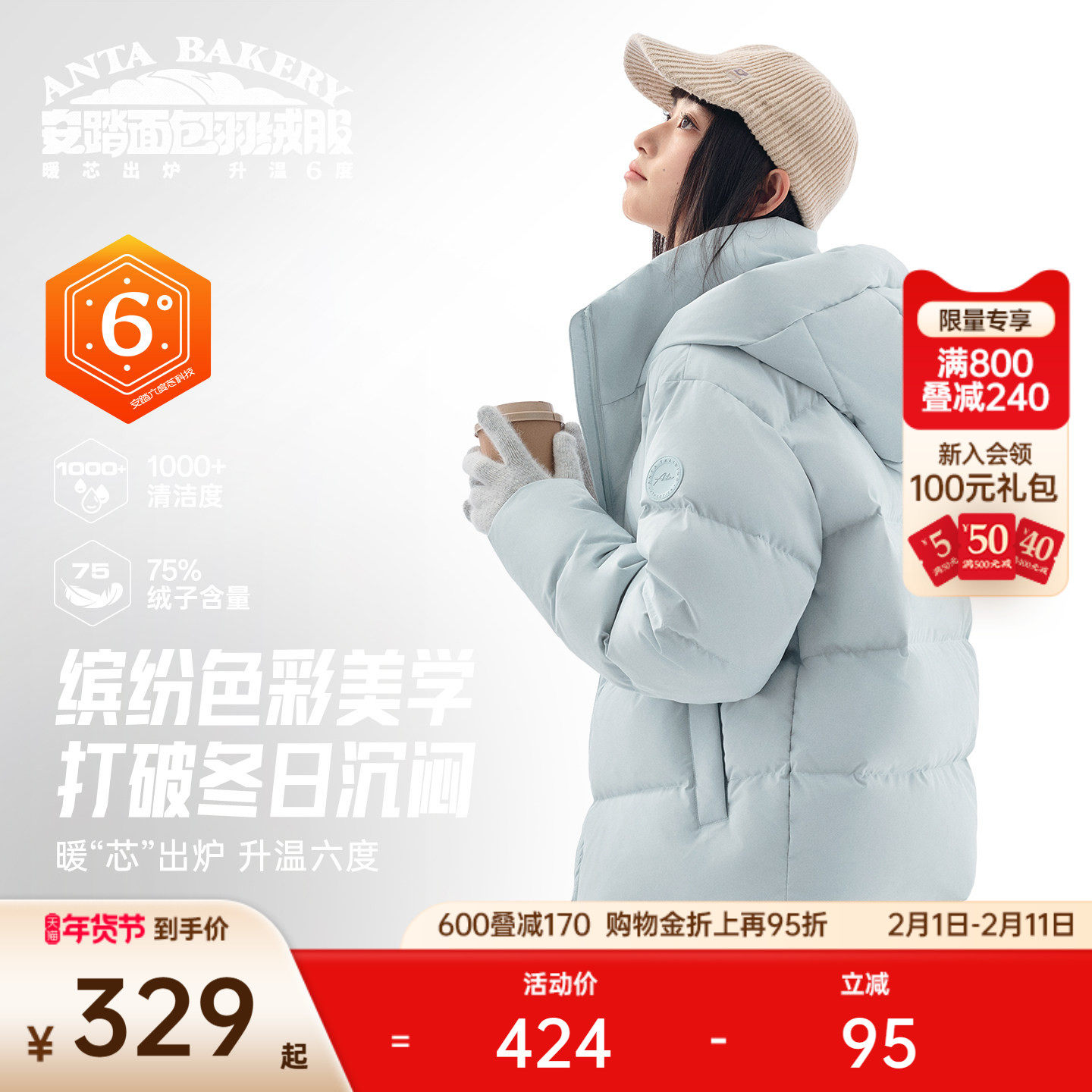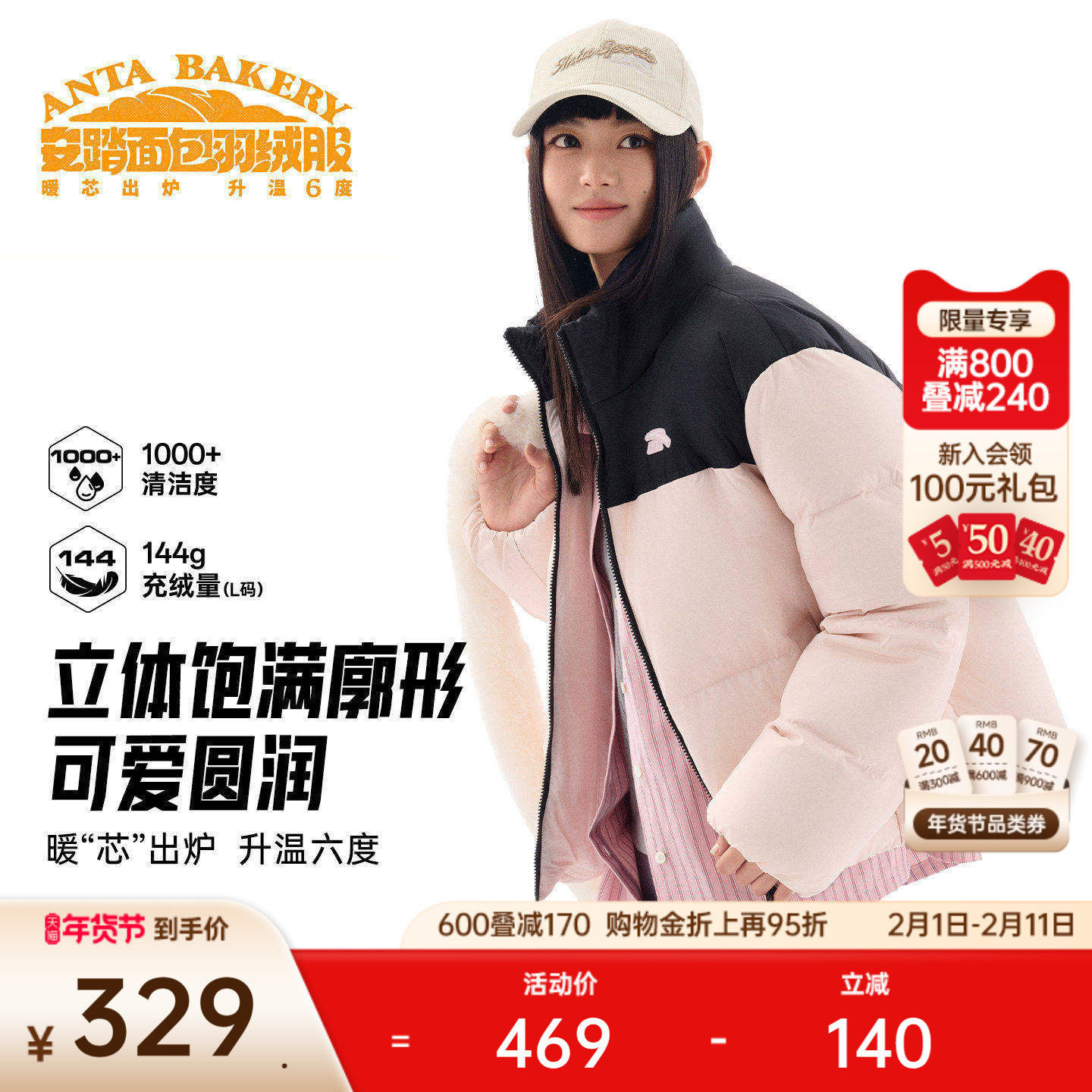 安踏面包羽绒丨防泼水高蓬松羽绒服女士2025冬季新款鸭绒保暖外套