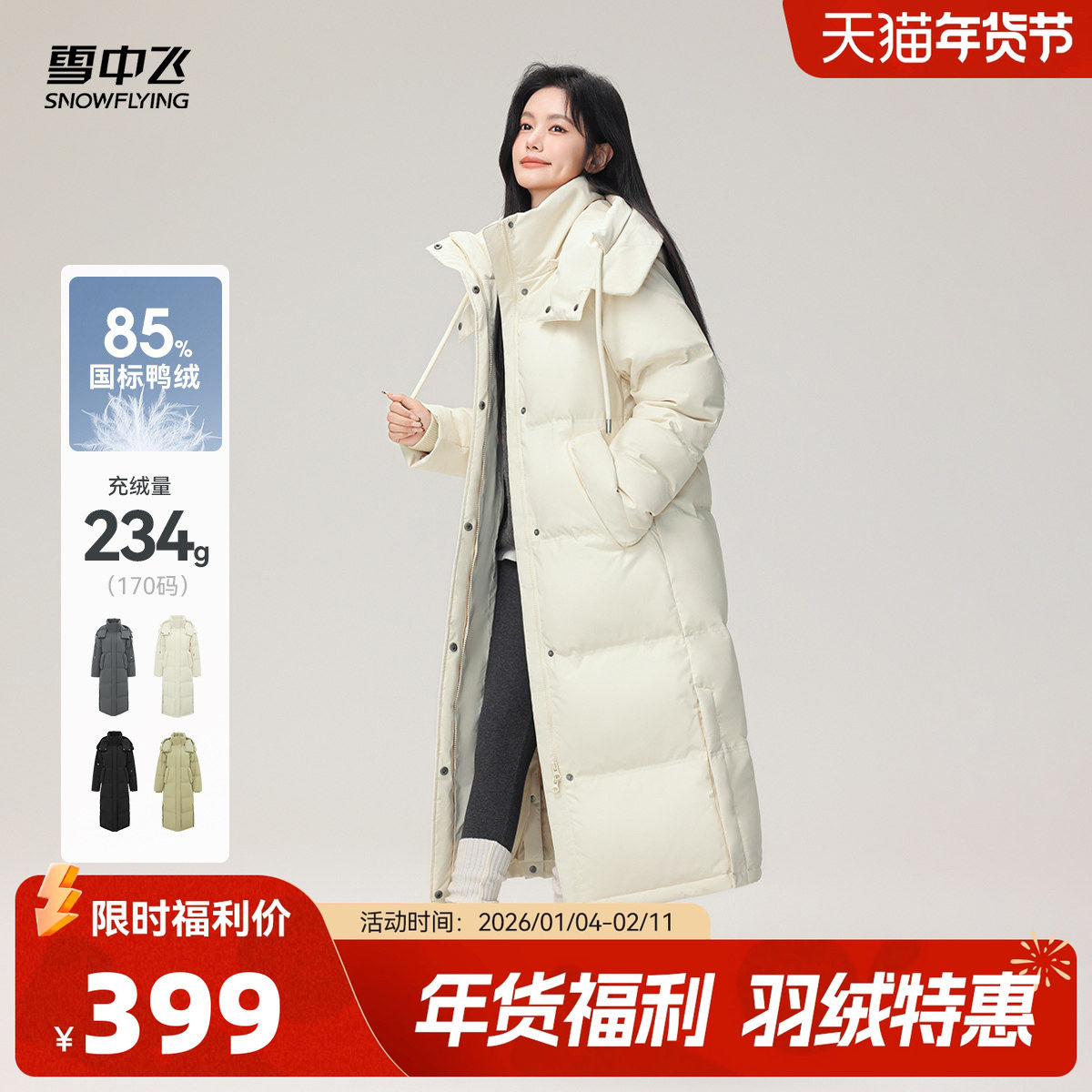 雪中飞2026春新款女士中长款羽绒服连帽加厚保暖韩版廓形纯色