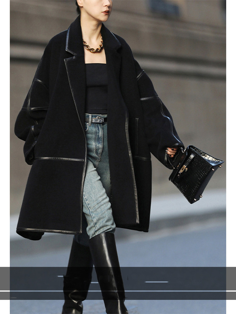 新简约进口拼绵羊皮时髦休闲气质炸街高支全羊毛呢大衣外套女秋冬