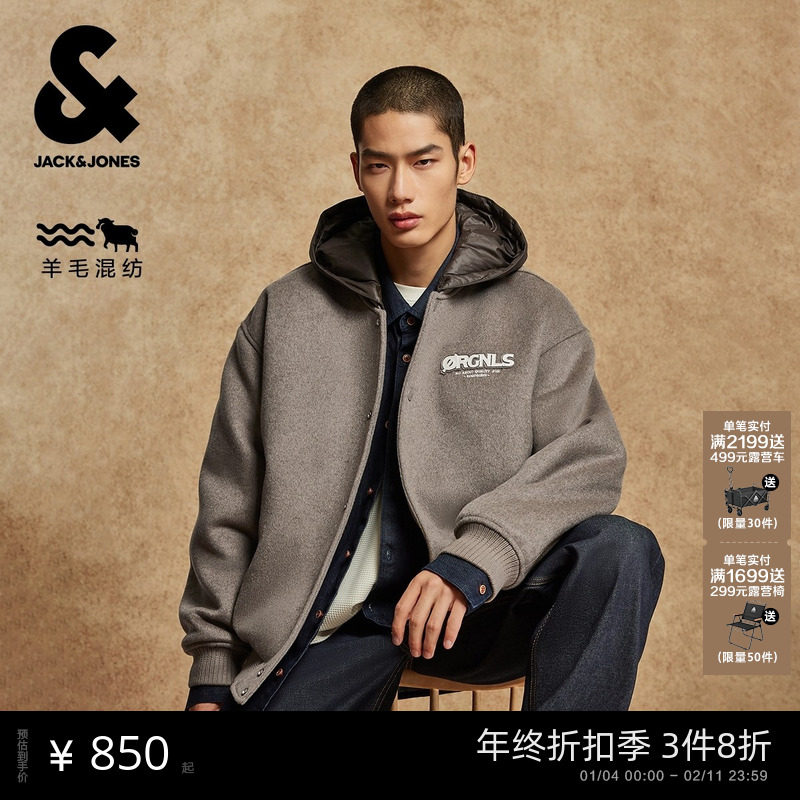 杰克琼斯男装冬季毛呢大衣夹棉可拆卸连帽棒球领含羊毛通勤风外套