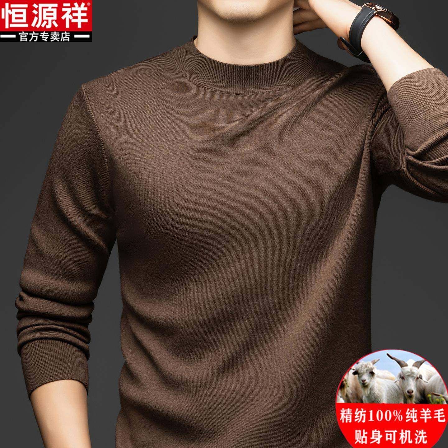 恒源祥可机洗精纺100%纯羊毛衫男士半高领打底衫秋冬加厚针织毛衣