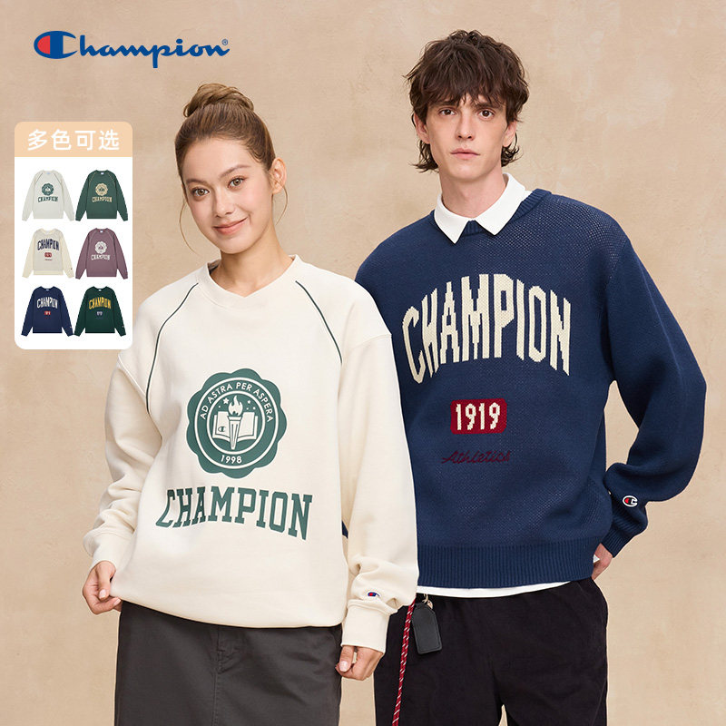 Champion冠军长袖圆领毛衣男2025冬季新款情侣加绒卫衣学院风潮牌