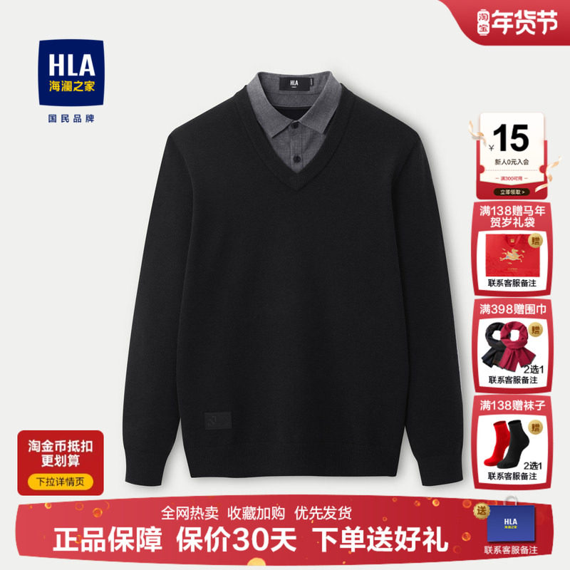 HLA/海澜之家翻领保暖针织衫2025冬季新纯色爸爸双领假两件毛衣男